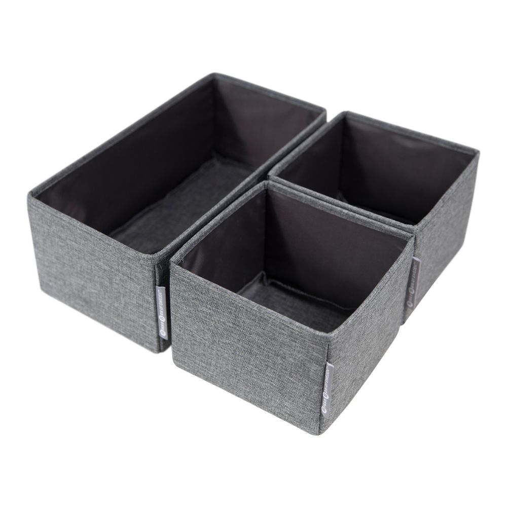 Cette solution de rangement pratique se compose de trois éléments : une grande boîte et deux plus petites – parfaites pour organiser les sous-vêtements, les chaussettes, les accessoires et les petits vêtements. L'ensemble est proposé dans une douce teinte grise qui s’intègre harmonieusement dans la plupart des intérieurs et dressings.