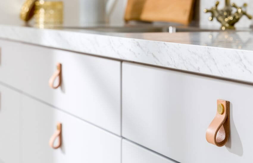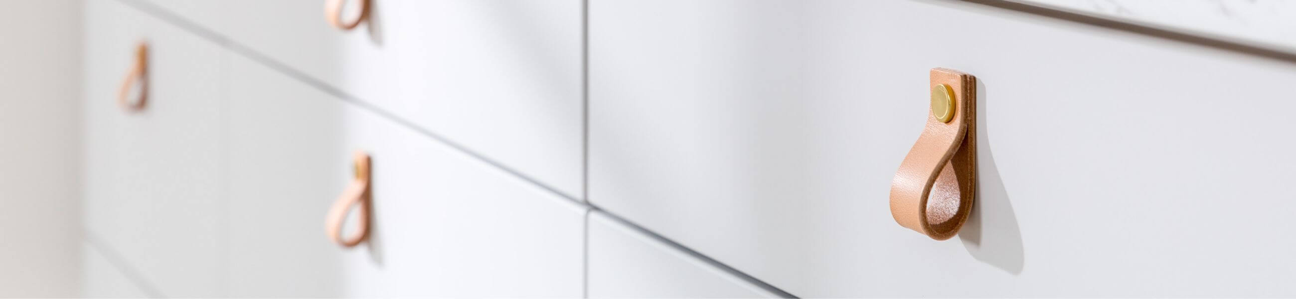 Renouvelez le style de vos armoires de cuisine ou de vos tiroirs avec les nouveaux boutons en cuir de Beslag Design. Nos boutons en cuir sont comme une poignée à double poids et donnent non seulement à votre maison un style plus luxueux, mais ont également une fonction importante qui facilite l'ouverture des tiroirs et des armoires. Le matériau est du cuir écologique et naturellement tanné de la tannerie de Tärnsjö qui ne fait que s'embellir avec le temps. Combinez les boutons en cuir avec nos élégantes poignées en cuir pour associer le style de votre maison. Mettre de nouveaux boutons dans la cuisine, la salle de bain ou les armoires est l'une des façons les plus simples de renouveler votre maison, ce sont les détails qui donnent toute la décoration intérieure. .