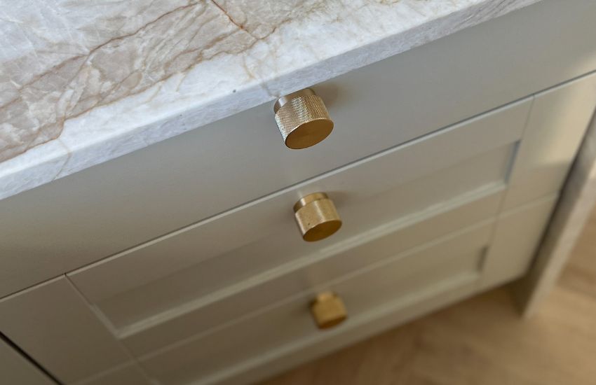 • Boutons en laiton brossé: Le laiton brossé a une finition lisse et brossée qui donne une sensation moderne et élégante. La finition brossée offre un éclat doux qui ajoute une touche sophistiquée à l'intérieur.